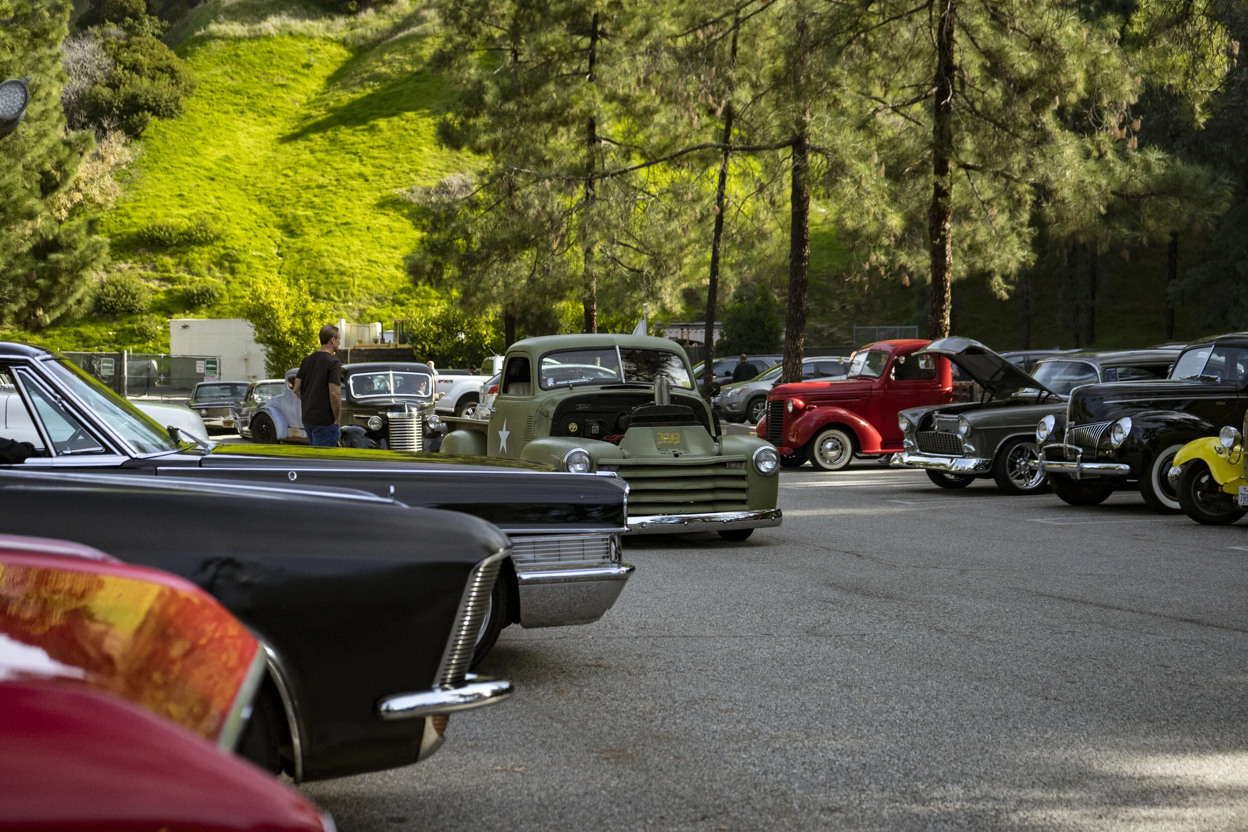 With the incomparable blast of a vintage horn as the only warning, it was time to take off on our cruise. The destination was vaguely described as a breakfast joint in Los Feliz. Sixty pieces of automotive history took to the mildly winding roads of Griffith park. The weather was perfect. While the Santa Ana winds make the lives of San Fernando Valley residents dry and frustrated, the winds sweep away the residual smog. With wind speeds up to 50 miles per hour the night before, the sky was windswept clear and the scenic cruise was about as pretty as a massive park surrounded by 29 million people can be. The route was relatively simple. We left from Travel town and took to the Griffith Park backroads. We cruised passed the LA Zoo where a few excited onlookers stood along the sidewalk to watch our procession. One of the best parts of a car cruise is seeing the expressions of those around. Unlike with many other types of automobiles, despite the overly loud exhaust, the fumes, the loud music, and the occasional smoky tires, the general public seems to enjoy watching a line of classic cars roll through town. Had we been in BMW M3s, Porsches, or Subaru STIs instead, the phones used to record us in delight would have been replaced with single fingers (and not the pointing finger). If they did record us though, the videos would have been used for evidence. Being a rebel is tied into the classic American culture and as a result the classic car drivers are still able to get away with shenanigans that never would fly in modern cars.