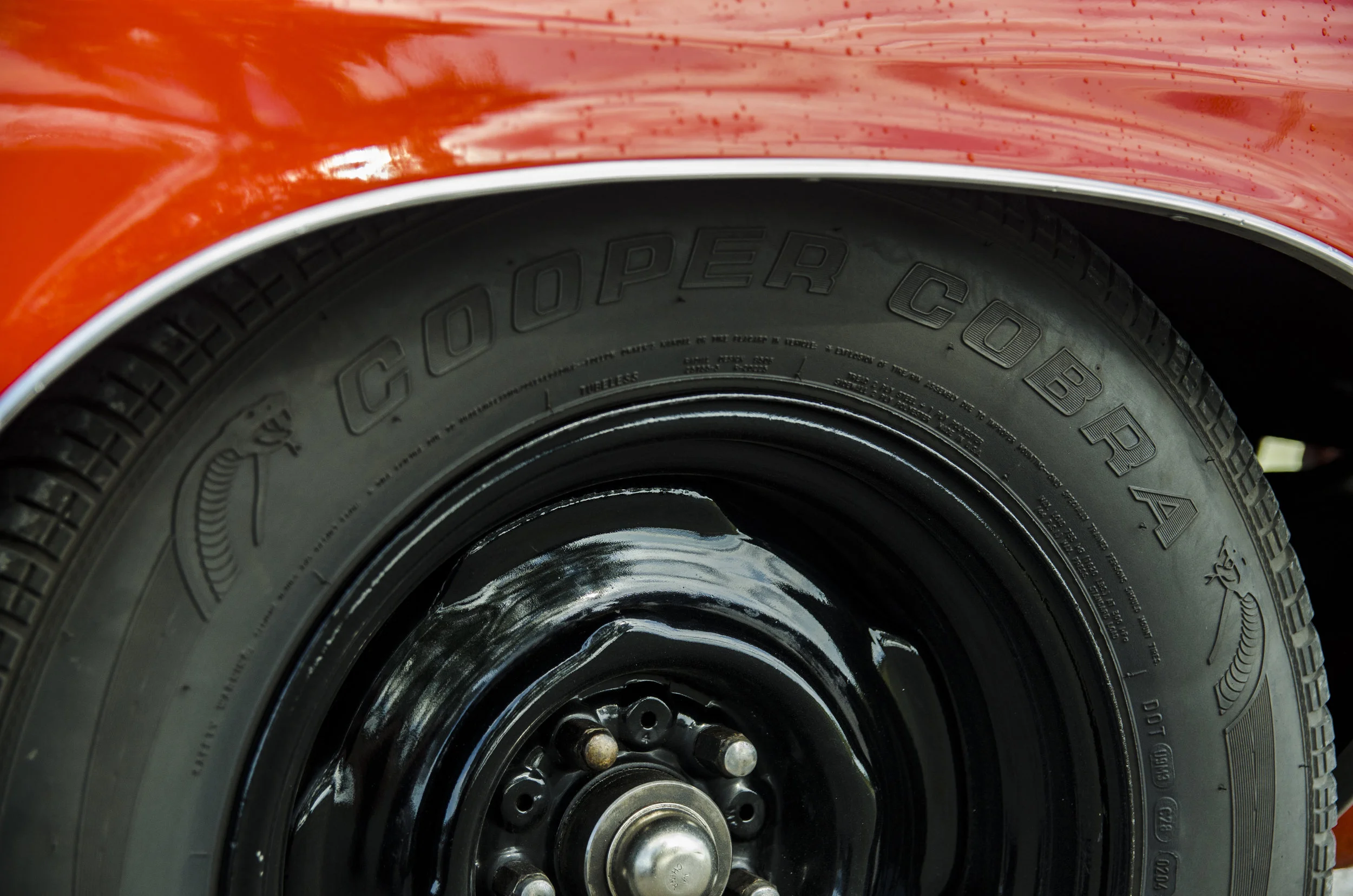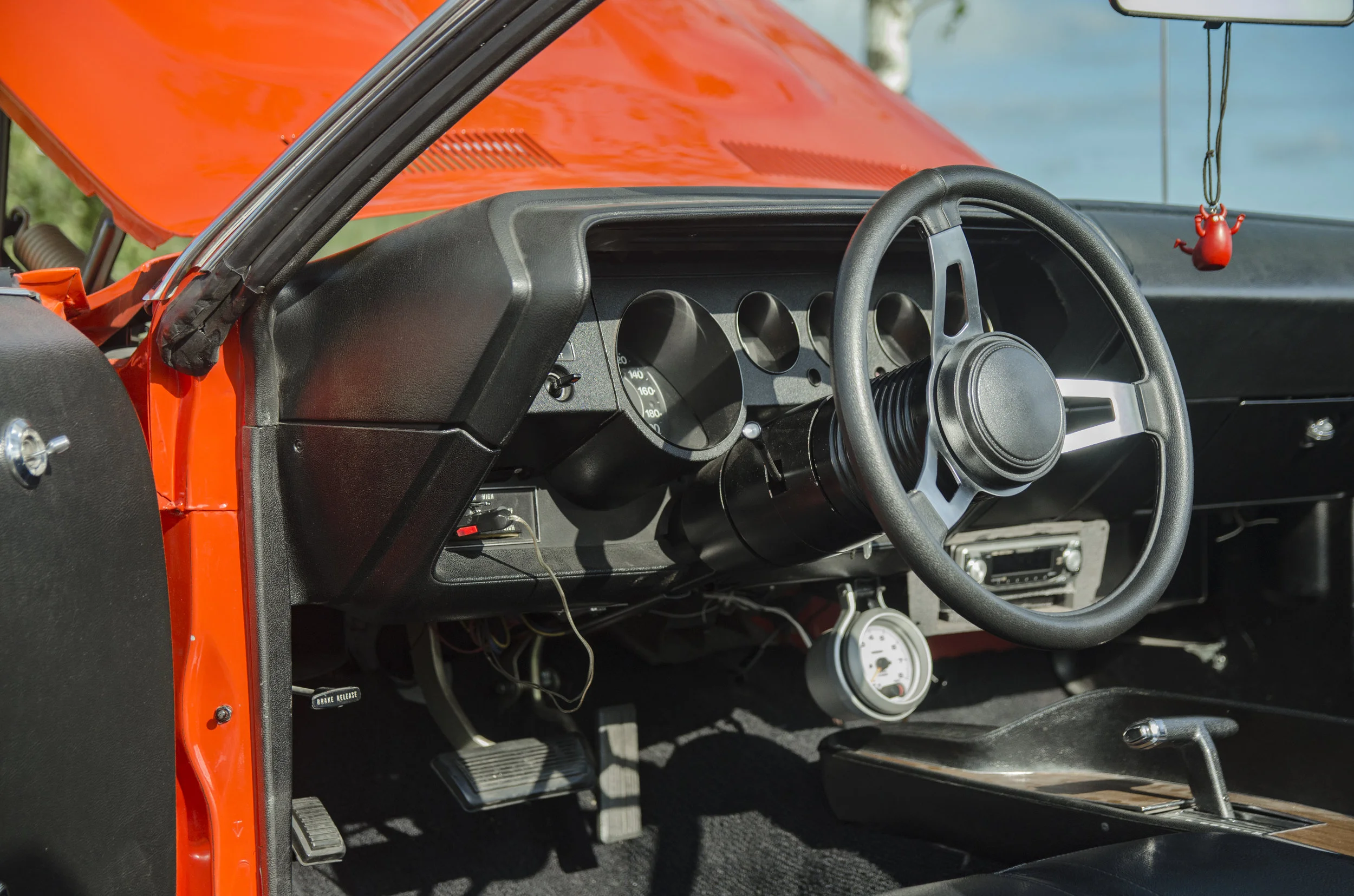 Roughly a week later, we reconvened to go for a drive. Fredrik meets us at an idyllic campground at Lake Dellen. Now that we were uninhibited by rain or road hungry lines of cars, we had the opportunity to take a closer look at the beautiful Plymouth Cuda. Model correct Hemi vinyls line the rear quarterpanels leaving no surprises as to what’s under the hood. The engine Fredrik used was a turn-key crate 426 Hemi. The engine is unmodified, except for chrome valve covers and a few dress-ups. The 426 is paired to a 727A three speed TorqueFlite automatic transmission with long gearing in the back. Exhaust flows in heavy handed notes that you feel in your stomach through stunning chrome finished long tube headers. Suspension is original and the car rests on humble steel wheels and authentic Cooper tires. Overall, the Cuda was in pristine condition. The black leather interior was even more striking in the clear light of day.